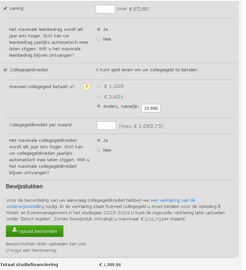 - Je kan ook meteen je bewijsstuk uploaden waaruit blijkt dat je een hoger collegegeld betaalt. Bij DUO ontstaat dan gelijk een Taak om dit te beoordelen. Je kan ook op een ander moment het bewijsstuk uploaden via Direct Regelen.