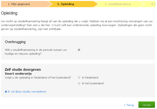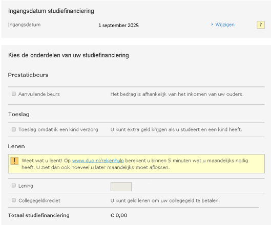 - Vervolgens selecteer je de onderdelen van de studiefinanciering waar je gebruik van wil maken (aanvullende beurs, lening, collegegeldkrediet).